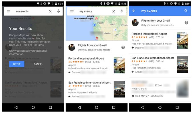 Na és hogy milyen adatokról van szó? Hát a közelgő eseményekhez kapcsolódó foglalásokról, repülésekről, éttermi helyekről, amelyekre aztán a my reservations, my events, my hotels, my flights kifejezésekkel rá is kereshetünk a Térkép kezelőfelületén.