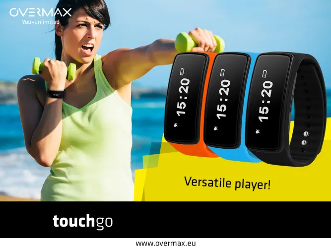 Inverz, jól olvasható (0,91”) OLED kijelző és letisztult formavilág jellemzi az Overmax Touch Go okoskarkötőjét, amely Android és iOS okostelefonokkal kompatibilis. Lépés-, kalória- és távolságszámlálót tartalmaz, a telefonnal Bluetooth 3.0 interfésszel és a hozzá tartozó saját alkalmazásán keresztül tartja a kapcsolatot, szinkronizálni a belső memóriája (128k) miatt heti egyszer is elegendő. A kijelző felbontása 128 x 32 képpont, microUSB-n tölthető, és három, különböző színű (fekete, narancssárga és kék) szíj is jár hozzá.