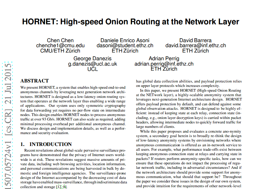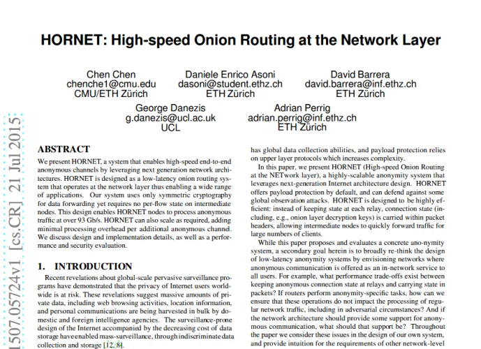 Svájci kutatók az amerikai Cornell Egyetem könyvtárában publikálták leírásukat az általuk kifejlesztett, alacsony válaszidejű, nagy sebességű hálózatról, amely magas fokú anonimitást kínál a felhasználóinak. A HORNET (High-speed Onion Routing at the Network Layer) könnyedén a Tor utódjává válhat, ugyanis vele 93 Gbit/s adatátviteli sebesség is biztosítható, miközben a küldő és a fogadó kiléte is titokban marad. A „hagymás” routolás során a hálózat kiemelt gépei végzik a különféle rétegek kódolását és továbbítását – ebben a HORNET és a Tor hasonlít egymásra. Akkor, ha kevés az ilyen gép, a hálózat kiszolgálása sem túl gyors, ezért a Tor 2 millió felhasználója gyakran tapasztalja a hálózat lassulását.