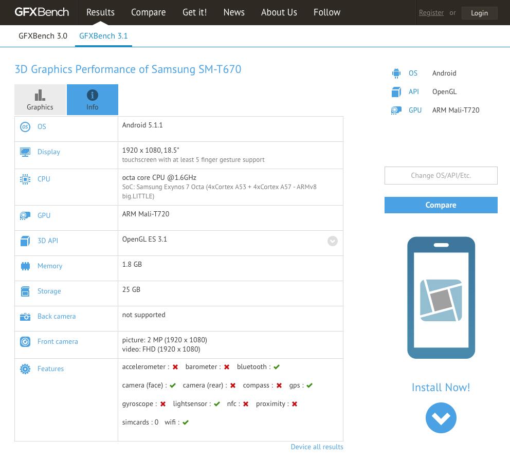 A GFXBench adatbázisában is megjelent készülékről az IFA 2015-ön már említést tett a Samsung, hivatalos kódja pedig az SM-T760 lett, a GFX-nél is így található meg. Az otthoni, irodai és iskolai felhasználásra is szánt hatalmas táblagépben Exynos 7580 SoC, 2 GB RAM, 32 GB háttértár és egy 2 Mpixeles előlapi kamera lesz.