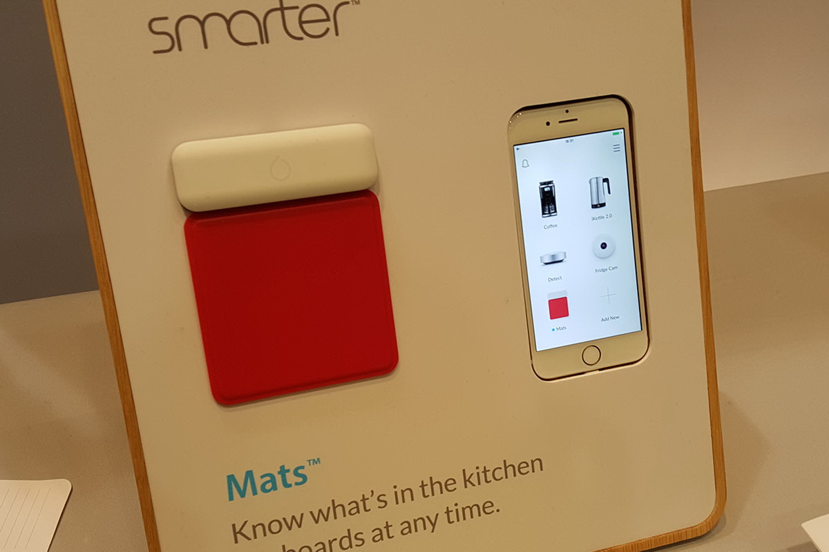 A Smarter nevű startup elhozott néhány érdekes prototípust a CES-re: nyomásérzékeny szenzorokat és egy hűtőbe szerelhető kamerát például. Előbbi Mats névre hallgat, és egy négyzetes alapterületű, egy vagy több elemből álló lapos kütyü, amely képes érzékelni, hogy van-e rajta valami. Ebből könnyű kitalálni, hogyan működik: a spájz vagy a hűtő polcaira kell rakni, a dolgokat pedig egyszerűen csak rá kell helyezni.