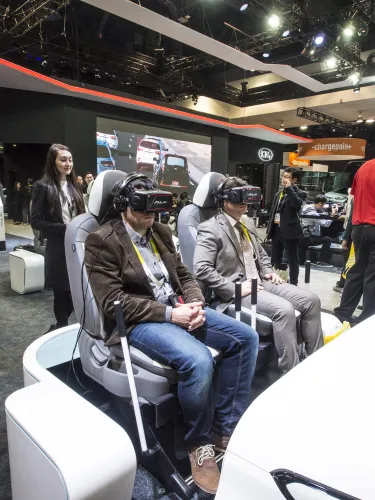 Persze az önvezető autó demonstráció elég messze áll a valóságtól, mégis állandó sor állt az Oculus Rift szemüvegekkel felszerelt ülések előtt. A Kia Soul EV motorháztető mögé tett ülések a 3D-s virtális valóságot rezgésekkel és egyéb mozgással próbálták élethűbbé tenni.