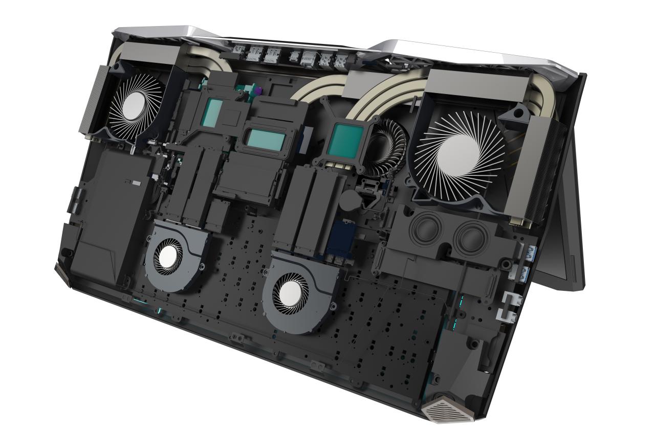 A gépben természetesen hardverből is a legdurvábbak találhatóak, Kaby Lake Core i7-ekkel, GeForce GTX 1080 kártyákkal (SLI-ben), G-Synckel, mélynyomóval és mechanikus billentyűzettel. A különleges megoldású hűtőrendszerben öt ventilátor dolgozik (ebből 3-ban fém lapátokkal). A dizájn része egyébként a billentyűzet felett egy átlátszó rész, amelyen keresztül az egyik ventilátor működése is figyelemmel követhető. Jópofa extra, hogy a klaviatúra numerikus része külön kivehető és megfordítható, amivel egy nagyobb méretű precíziós tapipadot kapunk.