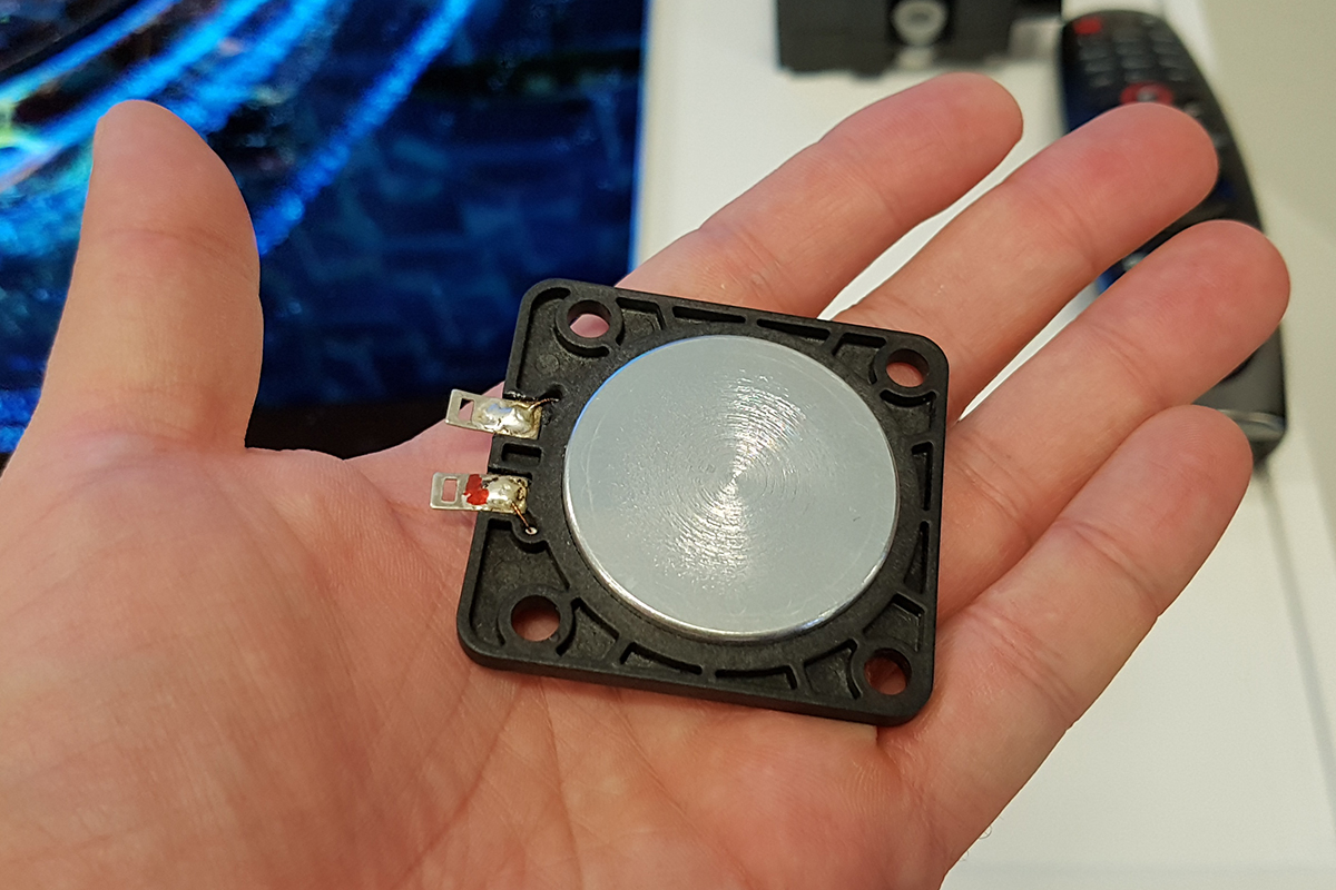 A furcsa megoldást az OLED-panel rugalmassága teszi lehetővé – azok a gyártók, akik csak LCD-ben gondolkodnak, nem fogják tudni lemásolni az ötletet, mert az LCD túl merev ahhoz, hogy membránként viselkedjék. Ahhoz, hogy a panel hangszóróként tudjon mozogni, kell természetesen egy driver is, ami rezegteti. Ez egy kompakt kis berendezés, egyetlen feladata az, hogy rezegjen. Mivel az LG (is) sztereo hangzásban gondolkodik, a driverből kettőre van szükség, ezeket a tévé két oldalán, nagyjából középen helyezik el. Készítettünk egy videót, amelyen a panel látszik működés közben: a búra alatt lévő golyók ugrándozásából látni, hogy a panel tényleg rezeg. A rezgés annyira gyors, hogy szabad szemmel nem lehet látni, így a képminőséget a Crystal Sound elvileg sehogyan sem befolyásolja.