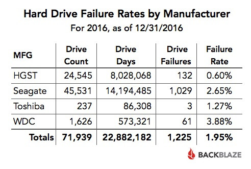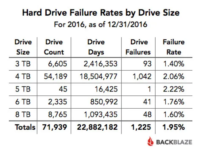 A vállalat legutóbbi jelentése 2016 utolsó negyedére vonatkozik. A vizsgált időszak során a Backblaze kb. 63 ezer meghajtót használt amelyek közül 1225 darab hibásodott meg, ez 1,95 százalékos hibaaránynak felel meg. A HDD-k összességében is megbízhatóbbak voltak, mivel 2015-ben a meghibásodási arány még 2,47 százak volt, 2014-ben pedig 6,39 százalék. Nem túl meglepő módon ezúttal is a kétlemezes meghajtók voltak a legmegbízhatóbbak, amelyek kapacitása jelenleg 3 TB.