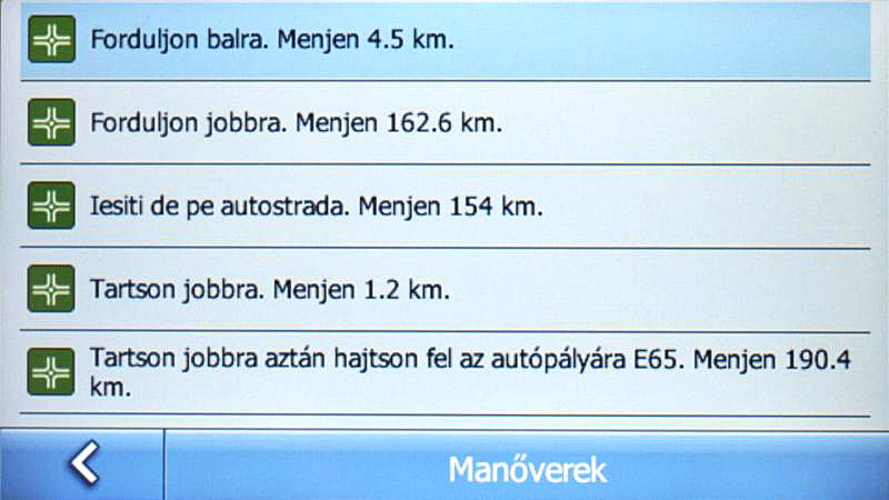Az útvonal megtervezése azonban sokat „romlott”, már ami a sebességet illeti: ugyanazt a Magyarország-Németország útvonalat a C520 9,57, míg a Moov 330 27,96 másodperc alatt tervezte meg (szerencsére rövidebb utaknál nincs ilyen különbség, az útvonal gyakorlatilag azonnal elkészül). Kifejezetten hiányoltuk az itinert is – a Moov által „manőverek listájának” nevezett ablakban gyakorlatilag utcanevek nélküli listát kapunk a fordulópontokról (hogy pontosak legyünk, egyes autópályák azért kapnak nevet). Egyelőre a – remélhetően – nem végleges firmware-nek tudjuk be ezt a hiányosságot, valamint azt a nagyobb hibát is, hogy egyes utasítások ékes román nyelven kerültek kiírásra. A javítás azért is valószínű, mert ha angol nyelvre kapcsoljuk a készüléket, az itiner is rötgtön kellően részletessé válik.