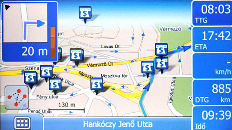 Bár a képernyő sokkal egyszerűbbnek tűnik az iGO alapú MioMapnál, valójában ugyanolyan jól használható navigáció közben (leszámítva a POI-k tolakodó megjelenítését). Egyedül talán az intelligens nagyítás hiányzott, bár az, hogy a következő, esetleg bonyolultabb manővert már előre láthatjuk, nagyon sokat segíthet például többszintes autópálya-kereszteződésekben.