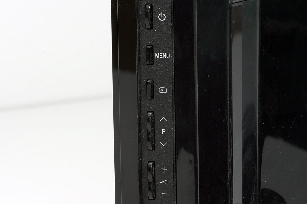 A kezelőszervek jobb oldalra kerültek, így az előlapot csak az érzékelők (távirányító és OCP szenzor, ami a környező fényviszonyokat méri) valamint a visszajelző LED-ek törik meg (be, OPC). Ezek egyébként a Sharp korábbi tévéihez hasonlóan apró méretűek.