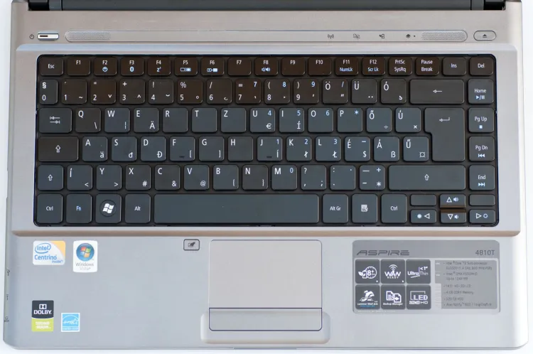Ha egyetlen szóval kellene jellemeznünk a 4810T külsejét, kicsit gondban lennénk – a gép ugyanis nagyon elegáns, de vannak apró megoldások, amely miatt mégsem mondhatjuk egy szürke üzleti noteszgépnek. Burkolatának színvilága a szürke különféle változataiból áll, és szerencsére a gyártó többé-kevésbé ellenállt az ujjlenyomat-vonzó fényes műanyagok használatának is.