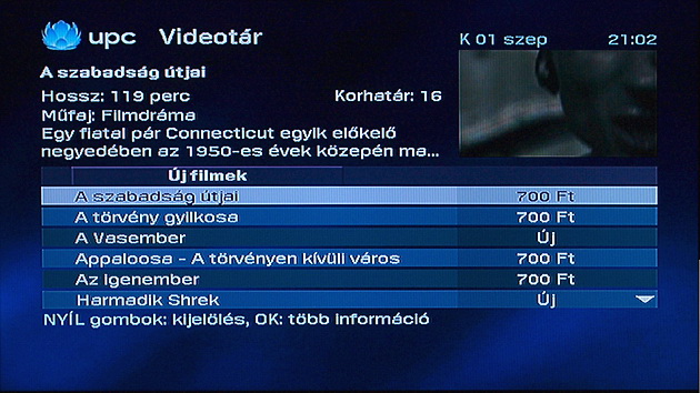 Ha megtetszett egy film, akkor az OK gombbal vagy az Info gombbal további adatokat kérhetünk le róla. Megtudhatjuk a film hosszát, korhatár-besorolását, műfaját, a rövid tartalmát, a főszereplők nevét, a gyártás évét, a képarányt és azt, hogy milyen nyelven érhető el az adott film. Ebben az ablakban látjuk azt is, hogy egy már kikölcsönzött filmnek mikor jár le a kölcsönzési ideje.