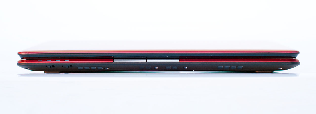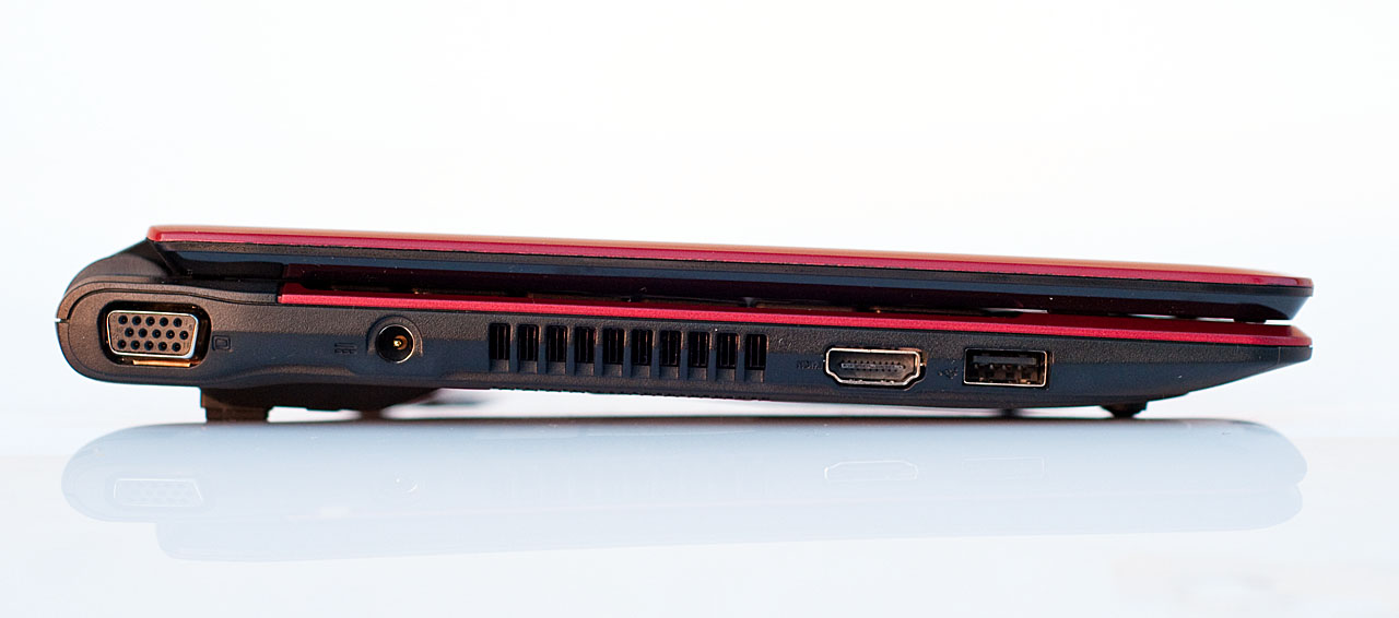 A készülék eleje és hátulja nagyjából üres, egyedül elöl-alul bal oldalon van két kapcsoló, amelyekkel a Bluetooth és a WLAN adapter kapcsolható ki-be. A jobb oldalra került még egy USB port, egy HDMI és egy D-Sub kimenet, illetve itt van a tápcsatlakozó és a hűtőrendszer nyílása is. Ez utóbb egyébként hasonlóan a 4810T-hez olyan, hogy sem a gép alja, sem a teteje nem melegszik, így nem égetjük meg sem a csuklónkat, sem a combunkat.