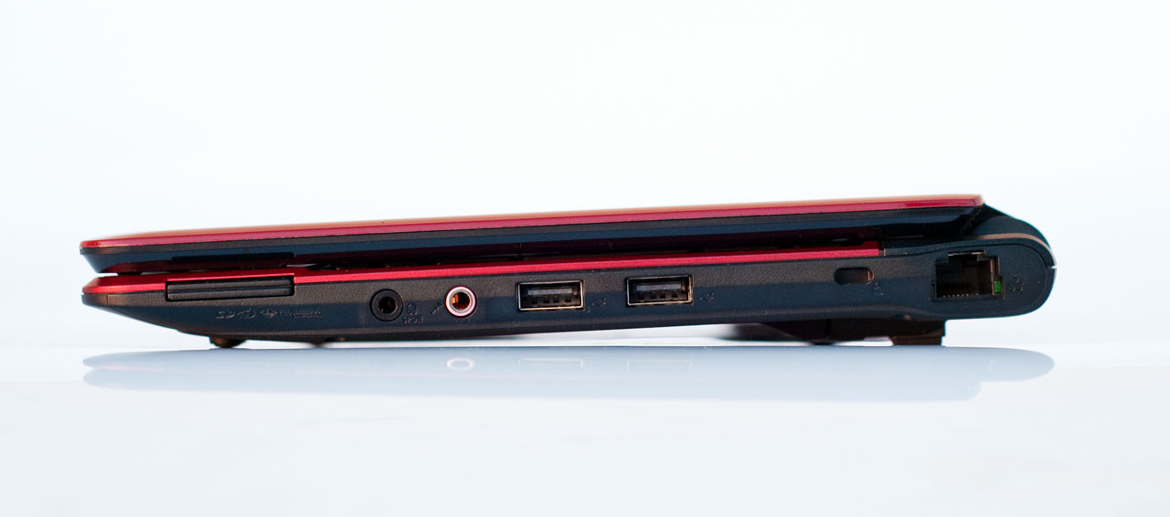 Kis gépre nehéz sok csatlakozót tenni – a 1810TZ sem fog minket ezen a területen elkápráztatni. Jobb oldalán egy kártyaolvasó (SD, xD és Memory Stick kompatibilitással), hangcsatlakozók (a fülhallgató-kimenet S/PDIF-ként is szolgál) és két USB található. Kicsit hátrébb került a Kensington-zár nyílása, a leghátsó sarokban pedig a Gigabit Ethernet csatlakozója található.