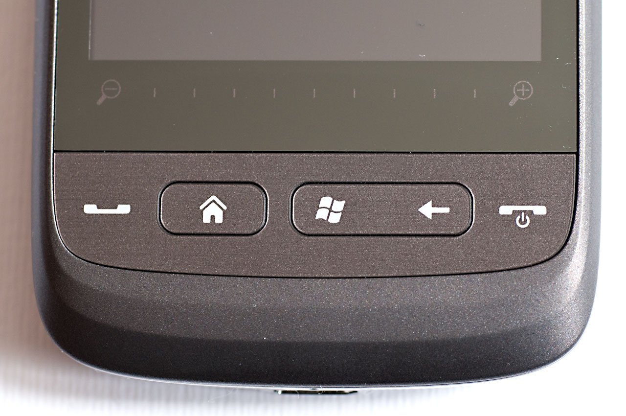 A kedvező ár ellenére sem mondható, hogy a Touch2 kívülről ne lenne igényes: a kijelző alatt egy, a nagyítást szabályzó érintőcsúszka, az alatt pedig egy szálhúzott alumínium betét található, amire összesen öt gomb került. Ezek mechanikája igényes, benyomásukról határozott visszajelzést kapunk. A két szélső gomb a hívások fogadását és befejezését szolgálja (az utóbbi egyben a power-gomb is), a „ház” a kezdőképernyőt, a Windows-ikon a megszokott módon a Start menüt hívja elő, a balra mutató nyíl pedig a menüben és alkalmazásokban a visszalépésre szolgál.
