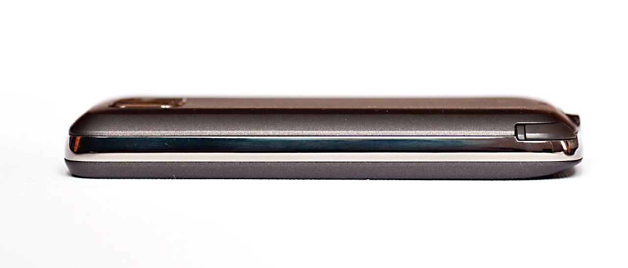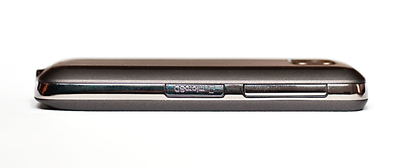 A képernyő felett elhelyezett apró lyukakkal borított lemez mögött rejtőzik a hangszóró és a visszajelző LED is, a készülék oldalai viszont meglehetősen csupaszok: bal oldalon fent található a hangerőszabályzó billentyű, alatta pedig a microSD kártya foglalatát takaró fedél. Ezt kinyitni egyébként csak a hátlap eltávolítása után lehet, ami elég furcsa megoldás, de legalább a fedél maga biztosan nem fog lötyögni vagy véletlenül felnyílni.