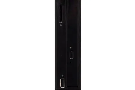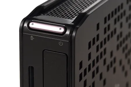 A gép a legszebbek között már biztosan nincs, az XS35 széria sem elölről, sem oldalról nem tartozik a legdizájnosabb gépek közé – ez utóbbinak azonban nagyon is jó oka van, amire rögtön vissza is térünk. Az előlap fényes fekete színű, és mivel komplett konfigurációt kaptunk, ehhez a színhez az optikai meghajtó is tökéletesen passzol. Aki viszont külön vásárolja meg a Blu-ray- vagy DVD-meghajtót, annak a fényes előlap problémát okozhat. Elöl egy USB portot és egy négyfunkciós kártyaolvasót is találunk, illetve a felső élen helyezték el a bekapcsoló és a reset gombot is. A két gomb fizikailag tulajdonképpen csak egy, amelynek a két funkcióját a gomb két oldala látja el. Ebbe a gombba építették bele a gombostűfejnyi méretű visszajelző LED-eket is, amelyek közül a fehér színnel világító jobb oldali a bekapcsolt állapotot jelzi, a bal oldali pedig, kék, villogó fénnyel, a lemezműveletekről kapunk értesítést.