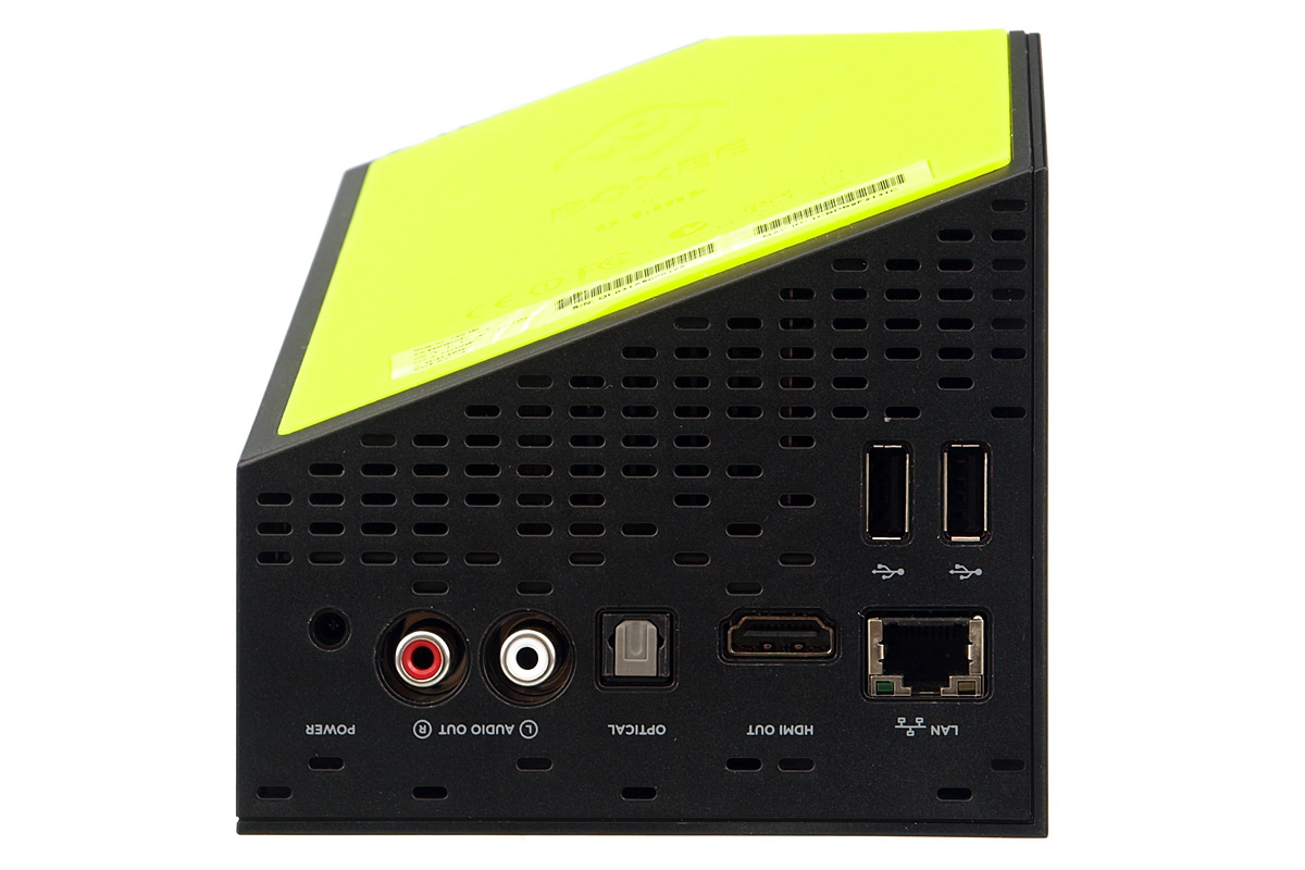 A Boxee Box hátoldalán kevés csatlakozó kapott helyet, de a D-Link okosan válogatott, így ami igazán számít, az minden rendelkezésre áll. A legfontosabb a HDMI 1.3 videokimenet természetesen, ami akár a hang továbbítására is képes. Emellett kapunk optikai hangkimenetet illetve sztereo RCA hangcsatlakozókat, két USB 2.0 portot, valamint egy megabites LAN adaptert is. Bár nem látszik, van természetesen WLAN is. A Boxee Box oldalán ezen kívül egy SD/MMC kártyaolvasót is találunk, ami legfeljebb 32 Gbájtos kártyákat tud kezelni.