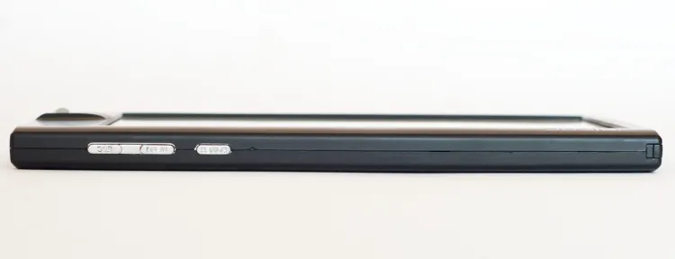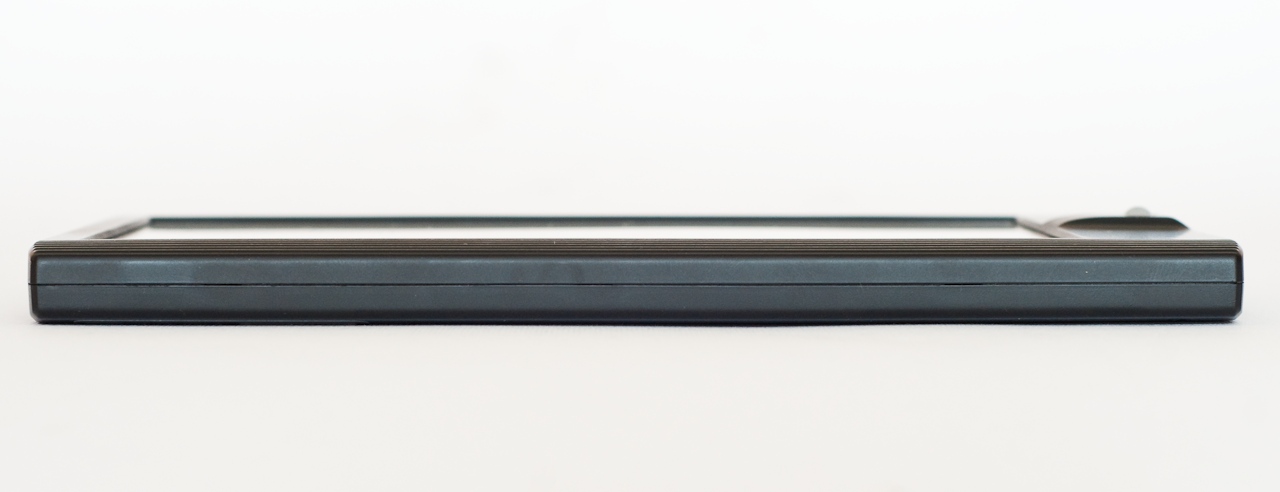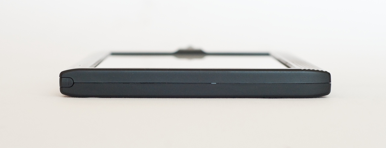 A 7”-os kijelző természetesen elfoglalja az előlap nagy részét, a körülötte található keret pedig átlagos méretű. Egyedül a jobb oldalon szélesedik ki, egyrészt azért, mert itt található a már említett trackball, másrészt azért, mert itt vannak a csatlakozók is, és ezeknek szükségük volt a helyre. Ezen a szélesebb részen felül van a beépített mikrofon nyílása is, ami például VoIP hívások alatt jöhet jól – vagy akkor, ha diktafonként akarjuk használni a készüléket.
