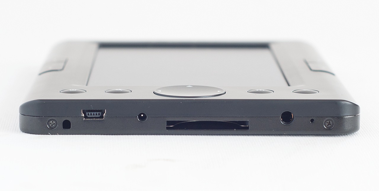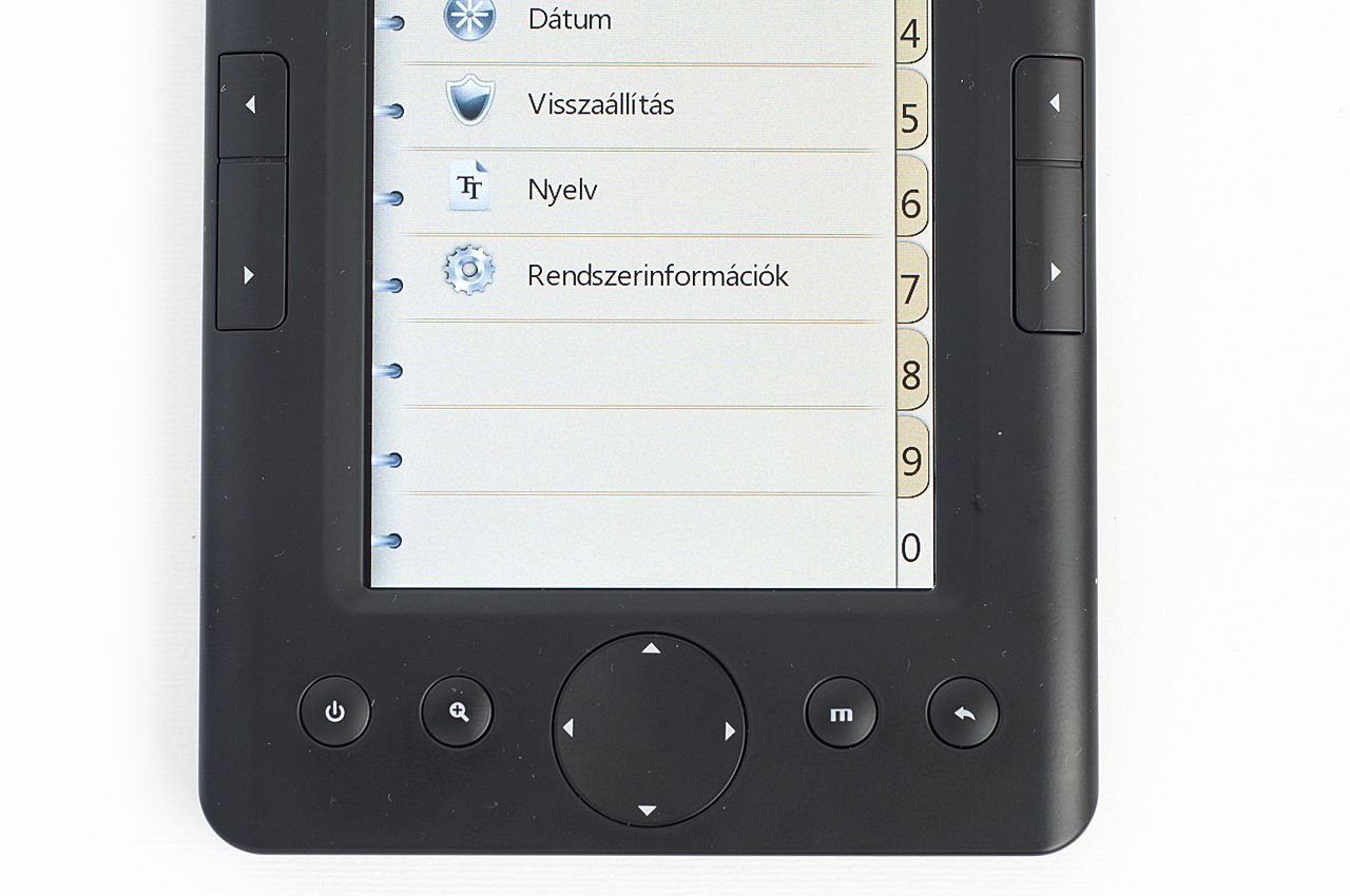 Az olvasó felépítése meglepetést senkinek sem fog okozni: az előlapot majdnem teljes egészében az 5”-os, 800×480 pixeles kijelző foglalja el. Mivel nem érintésérzékeny, az e-book kezelésre csak a körülötte elhelyezett gombokat használhatjuk. Ezekből két-két pár oldalra került; segítségükkel lapozni tudunk, illetve lejátszó üzemmódban a hangerőt állítgatni. A lent középen elhelyezett négyirányú paddal a menükben mozoghatunk, lapozhatunk és lejátszás közben a play, pause, előre, hátra opciókat érjük el.