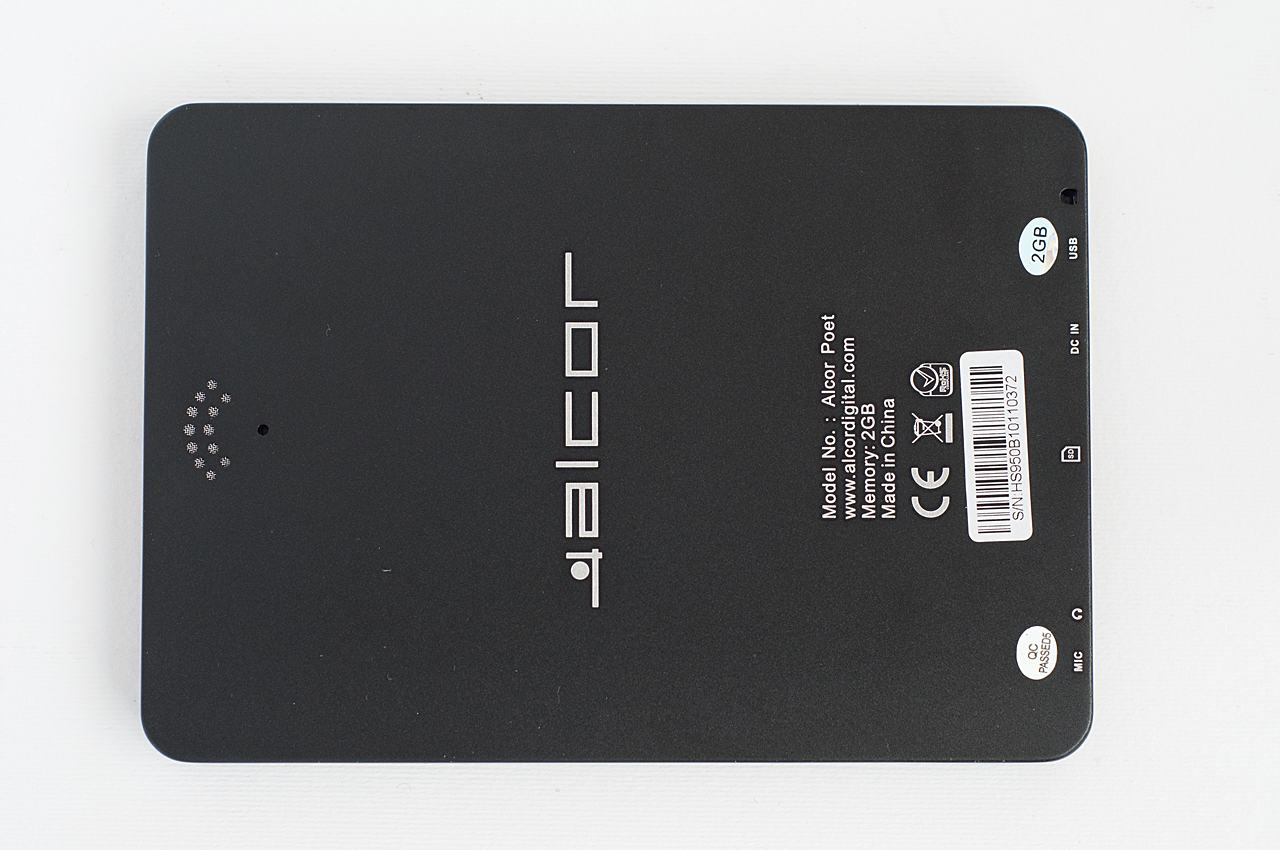 Az Alcortól teszteltünk már egy tabletet, a szintén olcsó e-Padot. A Poet kivitele nagyon hasonlít erre a gépre, a felhasznált anyagok szintén, és az igen gyenge, ujjunkkal is benyomható hátsó burkolattól sem menekültünk meg. Amiért ez itt kevésbé zavaró, az egyrészt az, hogy a készülék kisebb, tehát a hátlap valamivel merevebb, másrészt az e-book mellé kapunk egy egész jó tokot is, ami megvédi burkolatot a sérülésektől. Ugyanakkor a bal oldali lapozó benyomásánál még tokkal együtt is előfordult, hogy a kijelzőn egyes helyeken hullámok jelentek meg: ez valamilyen konstrukciós hibára utal: a gomb benyomásakor egy belső alkatrész nyomni kezdi az folyadékkristályt. A burkolat műanyaga selyemfényű, az ujjlenyomatokra így többé-kevésbé érzékeny, de örömmel tapasztaltuk, hogy a kijelző legalább matt, azaz nem tükröződik.