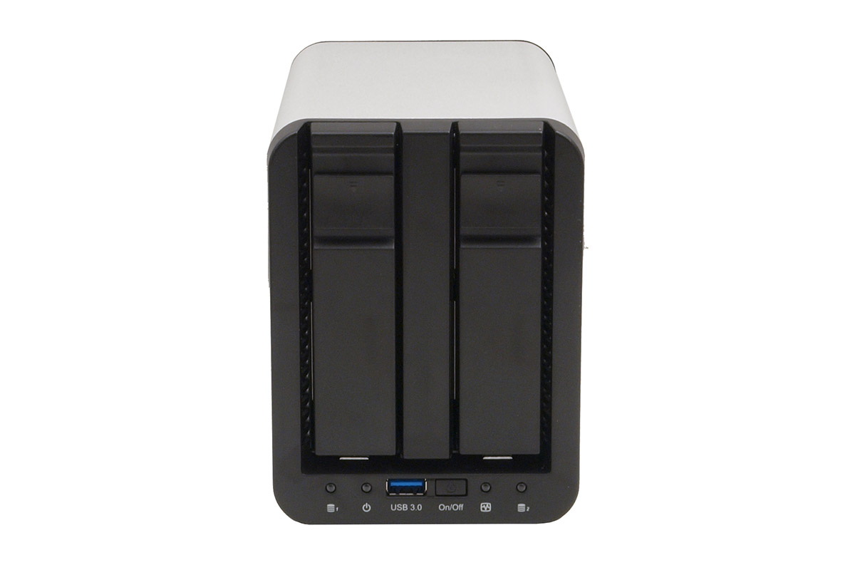 A merevlemezekhez a Silver Store 2-Drive NAS esetében elölről lehet hozzáférni, a tároló rekeszek két lehajtható ajtó mögött helyezkednek el. Mivel a NAS SATA merevlemezeket fogad, elvileg 2,5 colos meghajtókat is lehetne benne használni, viszont ebben az esetben nem tudjuk a HDD-ket rögzíteni, így mégis maradnunk kell a 3,5 colos formátumnál – ami persze nem baj, ha 5400 rpm-es merevlemezekből választunk, akkor sem a fogyasztás, sem a zajszint nem lesz nagy, és a 2,5 colos meghajtókkal összevetve olcsóbban kapunk nagyobb tárkapacitást.