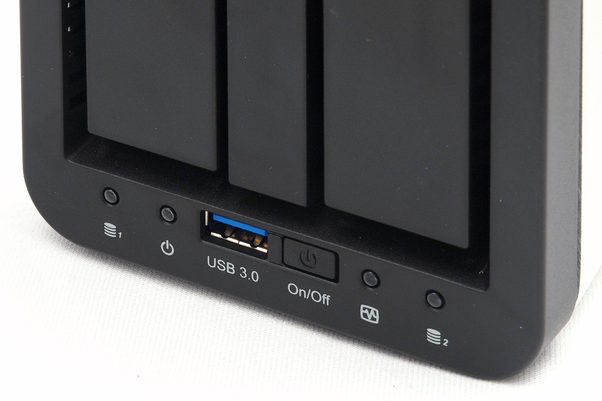 A működésről összesen négy LED tudósít minket: kettő a HDD-k állapotát mutatja, egy a NAS készenléti állapotában világít, egy pedig a diagnosztikában segít.