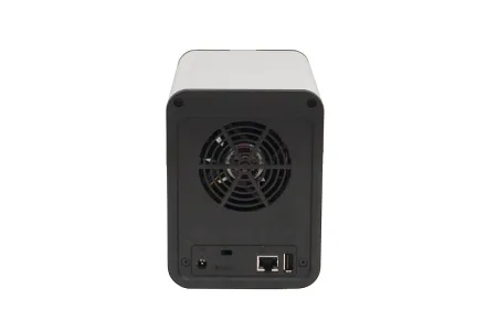 Korábban már említettük, hogy a ház oldalai fémből készültek, ami elvileg jót tesz a hőelvezetésnek. Bár ez a gyakorlatban is így van (működés közben szépen felmelegszik a NAS), a Freecom nem bízta pusztán a fizikára a HDD-k hűvösen tartását, a mérnökök hátra egy nagyméretű légkavarót is beépítettek. Ez szerencsére nagyon halk, így a NAS akkor sem lesz zavaró, ha folyamatosan működik. Ha nincs adatforgalom, akkor a HDD-k működése néhány perc után leáll.