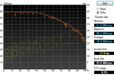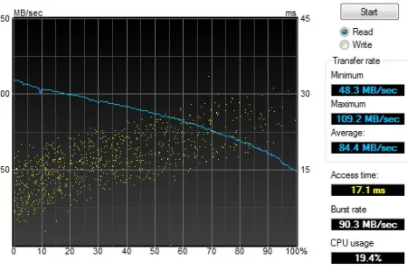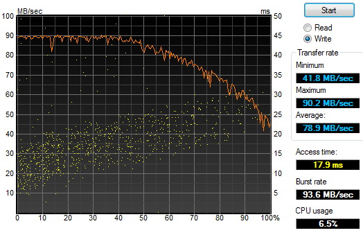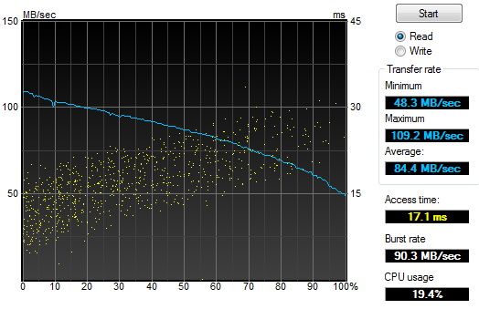 A meghajtó sebességét ezúttal is a HD Tune segítségével mértük le: a maximális olvasási sebesség a lemez elején 109 MB/s, átlagosan pedig 84 MB/s volt. Írásnál, ahogyan az USB 3.0 interfészre csatlakozó meghajtók esetében mindig, a teljes sebességet nem tudjuk kihasználni, a tempó 90 MB/s-ról indul, átlagosan pedig 79 MB-ot tudunk felírni másodpercenként. Az elérési idő a HDTune szerint 17,1 ms körüli, azaz a meghajtó hozza a papírformát (a gyári adat a késleltetést nem tartalmazza).