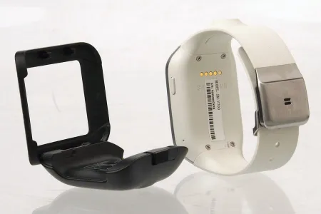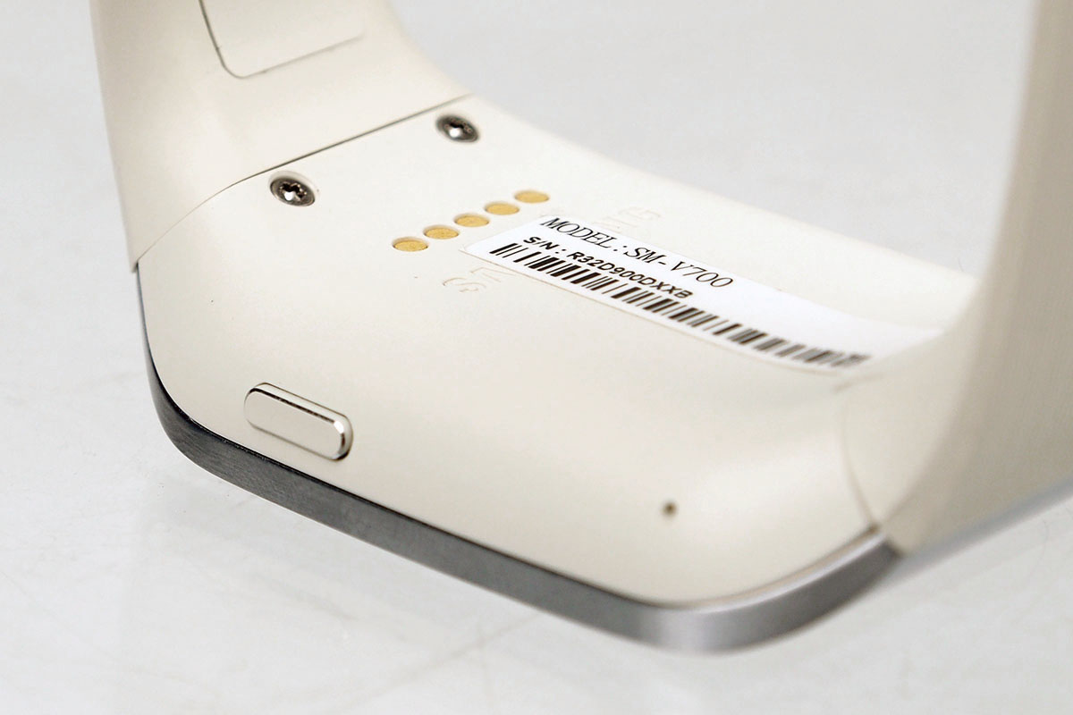 A készülékház és a szíj műanyag, a csat pedig ismét fém. Nálunk egy fehér színű szíjjal szerelt változat járt, de a Samsung többféle verzióban is készíti a Galaxy Geart, akár még narancssárga verziót is lehet belőle találni. Az órát alapvetően az érintőképernyő segítségével lehet kezelni, így érelemszerűen sok gomb nem kerül rá. A Samsung csak a jobb oldalra szerelt fel egyetlen egyet, amellyel az okosórát be- illetve kikapcsolni tudjuk, illetve, mint minden androidos kütyünél, ez a gomb egyben arra is szolgál(hat), hogy a készüléket felébresszük a készenléti állapotból. A Galaxy Gear két oldalára egy egy apró nyílás is került, ezek a mikrofonokat rejtik. Az óra töltéséhez speciális csatlakozót kapunk; sajnos a microUSB már nem fért bele a készülékházba, helyette egy sima, ötpólusú érintős csatlakozót kapunk.