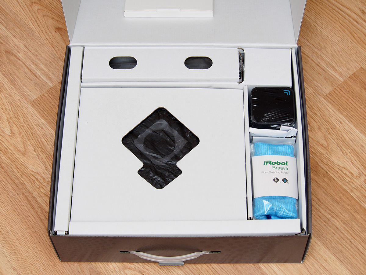 Az iRobot Braava 380 az új logó és modellnév mellett egy teljesen új, gazdaságosabb csomagolást is kapott. A Mint óriási, szabályos kockát formáló dobozát egy kb. 1/3 méretű lapos dobozra váltották, pedig majdnem minden eredeti tartozék a csomag része marat. Ez az apró módosítás jól mutatja, hogy milyen racionális cég az iRobot, és mennyire nem érezte ezt a területet az Evolution Robotics. A dobozban a következőket találjuk: