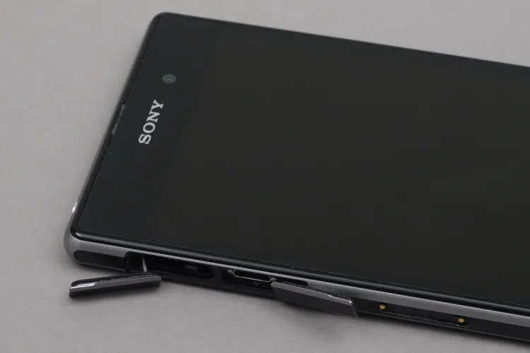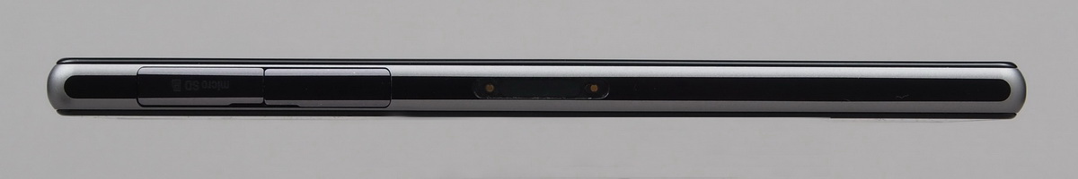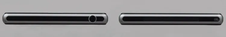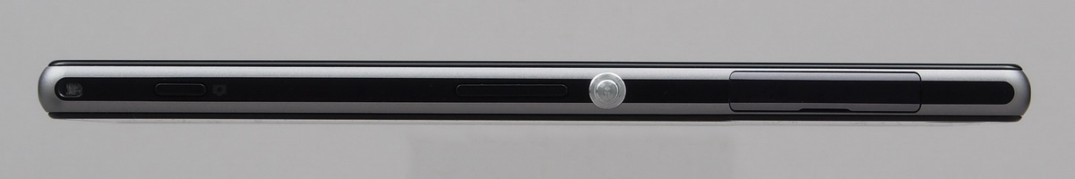 Ahogyan korábban már említettük, az oldalsó csatlakozókat a Sony ajtó mögé rejtette. Bal oldalra a microSD-kártya helye illetve a microUSB csatlakozó kerültek, míg a SIM-et (micro) a jobb oldalon tudjuk behelyezni. Szintén jobb oldalt találjuk meg a bekapcsoló gombot és a hangerő szabályozására szolgáló gombpárost valamint a dedikált exponálót is; a Sony szerencsére nem követte el azt a hibát, mint a Z-nél, nem felejtette le a fényképezéshez szükséges gombot a mobilról. A hangerőszabályzó sajnos nem a legjobb helyre került, ha rendesen fogjuk a telefont, akkor nem esik kézre, mert túl alacsonyan van. Csak összehasonlításképpen, az Xperia Z1-nél jóval kisebb Xperia SP-n több, mint 2 cm-rel feljebb találjuk meg a hasonló gombot. Az alsó élen a mikrofon nyílása, fent pedig a fülhallgató kimenet található. Utóbbi érdekessége, hogy a Sony ezt (valamint az oldalsó dokkoló csatlakozót) nem rejtette fedél alá, a vízálló kivitelt megoldotta máshogy – ennek nagyon örültünk, hiszen a Z egyik komoly problémája volt, hogy aki sokat hallgat zenét, de zsebben hordja a mobilt, annak a kis ajtócska gyakran útban van.