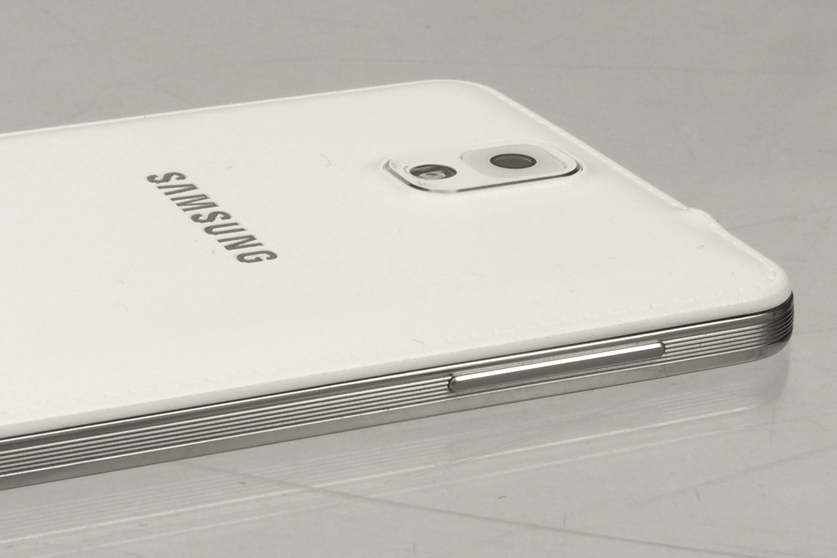Nálunk a fehér színű modell járt, de a telefon-tablet hibrid létezik feketében is – ízlés kérdése, hogy kinek melyik változat jön be jobban. A Galaxy Note 3 gyakorlatilag teljesen szögletes, ami az utóbbi időben egyáltalán nem volt jellemző a Samsung mobilokra a csúcskategóriában, legutóbb a Galaxy S II volt ennyire „kocka”. A készüléken a sarkokat leszámítva egyáltalán nincsenek íves formák, az élek is teljesen merőlegesek az elő- illetve hátlapra. A koreai gyártótól megszokott módon a Galaxy Note 3 teljes egészében műanyagból polikarbonátból készült, ám ez esetben az anyagválasztást tudjuk értékelni, mert egy fémházas verzió valószínűleg már nagyon nehéz lett volna. A műanyagok ellenére az összeszereléssel nincsen különösebb gond, az illesztések pontosak, a hátlap nem benyomható, stb. A telefon oldalán egy fémből készült díszítés fut végig, amely leeséskor védi valamelyest a mobilt a sérülésektől.