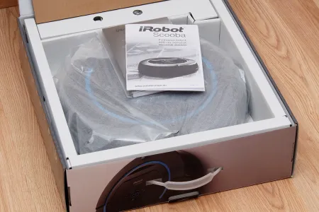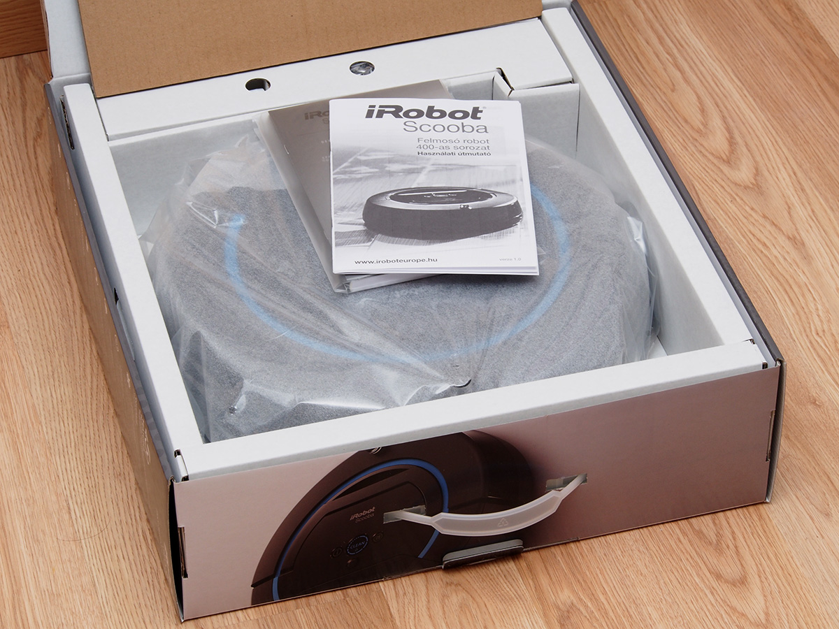 Az iRobot Scooba 450 az iRobot aktuális dizájnját követő stílusban készült papírdobozban érkezik, ami egyrészt jól eladja polcra kitett eszközt, másrészt a belül is papír elválasztó elemeknek hála a környezetet is óvja. A dobozban a következőket találjuk: