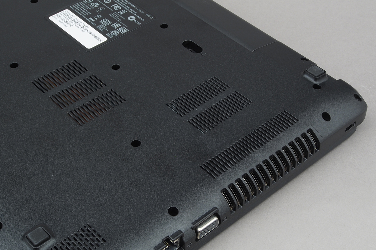 Elöl az SD-kártyaolvasó érdemel még említést. Bal oldalt (hátulról előre felé haladva) egy méretes hűtőrács, D-Sub kimenet, Ethernet port, DVI csatlakozó és USB 3.0 port sorakoznak, valamint ide került a mikrofon bemenettel kombinált fülhallgató kimenet is. Jobb oldalt elöl két USB 2.0 port helyezkedik el, mögöttük az optikai meghajtó, leghátul pedig a tápegység csatlakozója. A notebook hátsó része teljesen üres, lévén, hogy az akkumulátort ebből az irányból kell a helyére csúsztatni.
