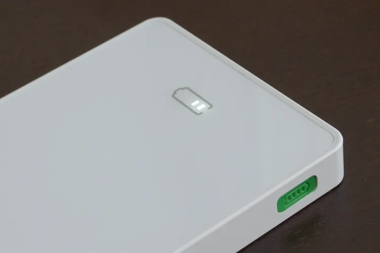 Az aktuális töltöttségi szintet mutató LED-ek az előlapon találhatók. Összesen négy apró LED van, ezekkel az elektronika 100, 70, 40 illetve 15 százalékos szinteket jelez. A merült állapotot (és mellesleg a töltést is) villogó fényforrás jelzi. A 10000 mAh-ás akkumulátort legfeljebb 1,5 amperrel tölthetjük, ami elméletben 6,6 órás töltési időt jelent, a gyakorlatban azonban ennél valamivel több, majdnem nyolc óra szükséges ahhoz, hogy a teljesen lemerített Li-ionos akkut teljesen feltöltsük.