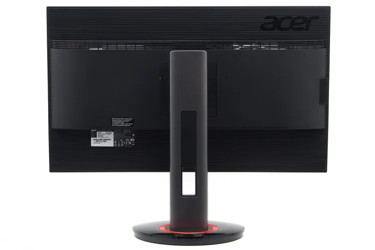 A talp szintén fényes fekete színezést kapott, de került rá egy vöröses-narancssárgás, kör alakú díszítés is. Elsőre akár azt is hihetnénk, hogy ez fémből van, de valójában sima plasztikról van szó. Ez egyébként azért került a monitorra, hogy jelezze, a megjelenítő a Predator sorozatba tartozik. Az állvány alsó részének formájából következtethető, hogy a monitor elforgatható, de a talp ezen kívül további érdekességeket is rejt: lehetővé teszi a kijelző emelését (0-15 cm), döntését (-5 és 35 fok között) és pivot módba állítását is.