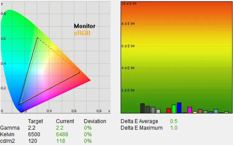 A legjobb beállításokat az alábbi helyeken találtuk meg: fényerő 24, kontraszt 52, az RGB értékeket pedig 51, 46, 46-ra lőttük be (az RGB azonban készülékfüggő!) Nem változtattuk viszont a LED-ek fényerősségén, mivel külön opció erre vonatkozóan nincsen a menüben. Fenti beállításokkal a 2,2-es gamma és a 6600K-s színhőmérséklet mellett 118 cd/m²-es fényerőt, 0,12 cd/m²-es feketét és 945:1-es kontrasztot mértünk. Érdekes módon a kontraszt magasabb lett valamivel, mint a TN-es kistestvérnél, ami azért meglepő, mert az IPS-panelek fekete és kontraszt szempontjából általában gyengén teljesítenek. A mérések alapján a monitor az sRGB színtér 98 százalékát képes lefedni, ami ebben az árkategóriában teljesen átlagosnak számít. Az átlagos deltaE értéke 0,5 lett, 1-es maximális eltéréssel. Ez igen jónak, mondhatni tökéletesnek számít.