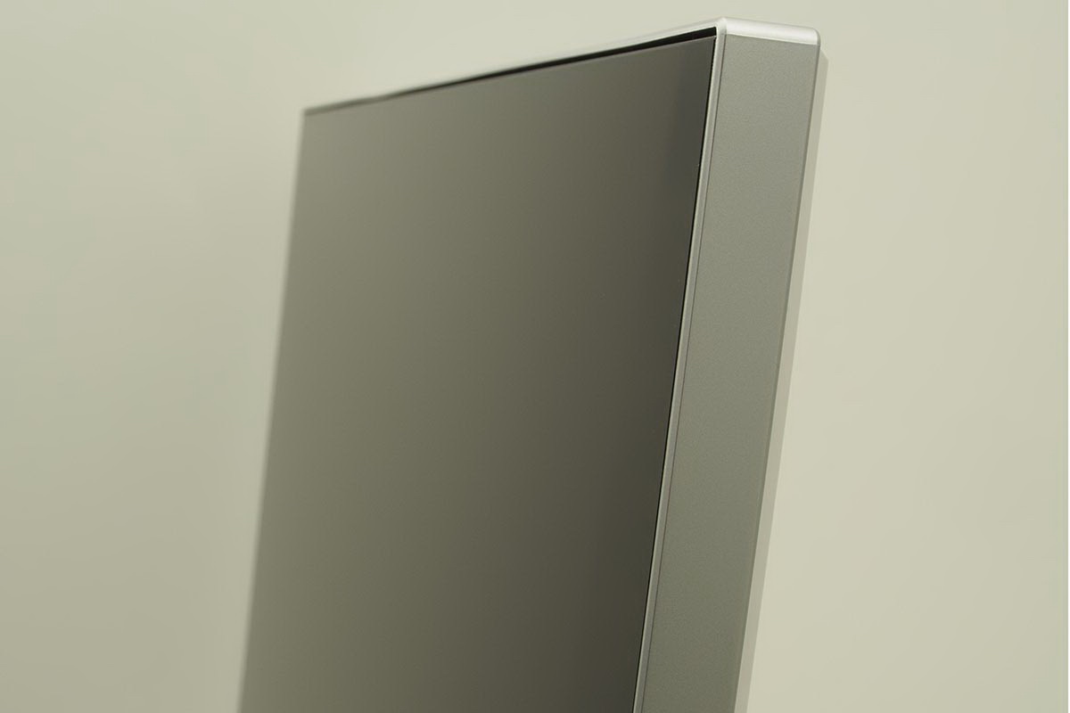 Mint minden ilyen esetben, a káva nélküli kialakítás ezúttal is azt jelenti, hogy látható káva nincsen, csak egy nagyon vékony oldalsó keret. Amely igényes, mivel nem műanyagból, hanem fémből készült. A kép azonban most sem kezdődik rögtön a monitor szélén, az első pixelek nyolc milliméterrel beljebb helyezkednek el. De kikapcsolva természetesen olyan, mintha nem lenne keret, és végső soron ez ennek a dizájnnak a légyege. Egyébként egy dolgot érdemes felvetni. Sokan szeretnék, ha végre az a pár milliméteres káva is teljesen eltűnne, véleményünk szerint azonban ez a vékony sáv nagyon is fontos: ha ez nem lenne, akkor esetlegesen a kép a monitor mögötti résszel egybefolyna, ami a láthatóság rovására menne.