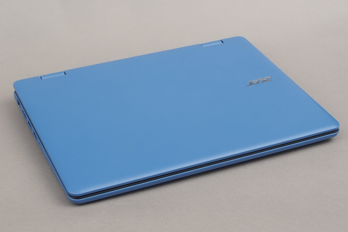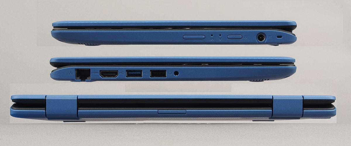 Hozzánk a kék verzió érkezett, amely első ránézésre is takaros gép benyomását kelti – készül a gép még fehérben is. Budget modellről van szó, ezért természetesen a borítás teljes egészében műanyagból készült, amely azonban mégsem kelti az olcsóság érzetét, mivel egyrészt matt, másrészt textúrázott felületek jellemzik a notebookot. Mintázat ráadásul nemcsak a monitor hátsó részére került, hanem a gép alsó részére is – egyedül az oldalak maradtak simák. A gép formája alapvetően klasszikus téglalap, aminek persze nem a mérnök fantáziátlansága volt az oka, hanem az, hogy az átfordítható kijelző tablet állásban így tud stabil pozíciót fogni. Sőt, a mérnökökre igazából egy rossz szavunk sem lehet, mivel az oldalaknál trükköztek egy picikét, hogy úgy tűnjön, előre felé haladva vékonyodik az egyébként végig 21 mm vastag ház. Ha már a méreteknél tartunk, a notebook alapterülete 298×213 mm, tömege pedig 1,5 kg. Utóbbi elég sok, és mivel nem szétszedhető dizájnról van szó, bizony tablet módban sem jobb a helyzet.
