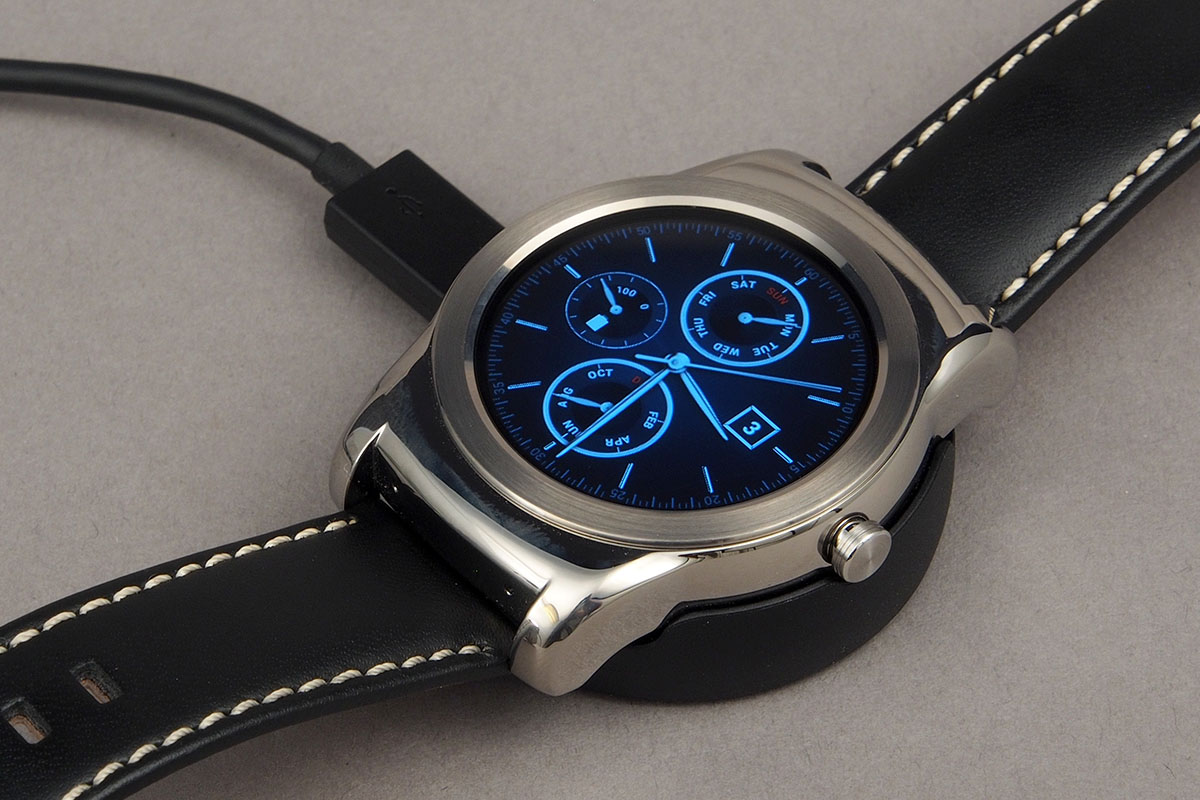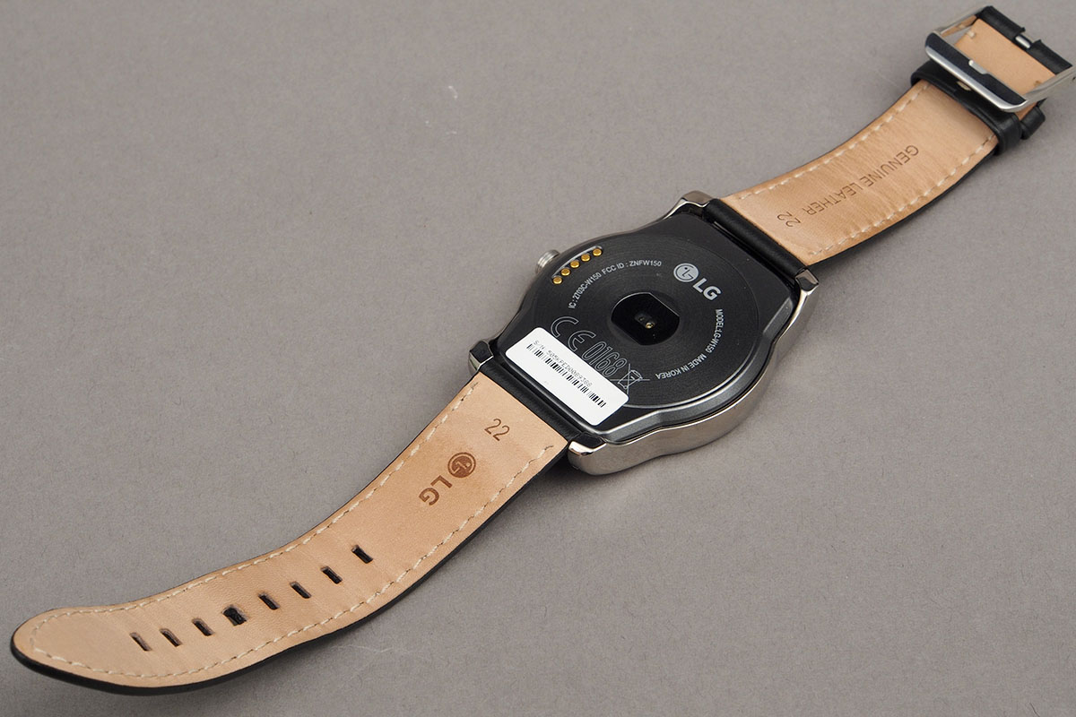Az óra vastagságáról még nem szóltunk: ez továbbra is 10 mm körüli, az LG mérnökeinek sem sikerült lefaragnia ebből. Sőt, a Watch R 9,7 mm-es készülékházához képest 1,2 mm-es többlet van. És hogy az óra ne legyen még vastagabb, számlapja és hátlapja is teljesen sík felületű, így egyesek számára esetleg kényelmetlen lehet a viselése. A hátlapon a töltéshez szükséges tüskék mellett egy pulzusmérőt találtuk még. A töltés bölcsős megoldással működik, a bölcsőt pedig egy mágnes tartja a helyén – összességében szerintünk jó ez, persze mivel speciális megoldásról van szó, hátrányként jelentkezik, hogy egy sima microUSB kábel nem elég a töltéshez (a bölcsőbe viszont már microUSB kábelt kell dugni).