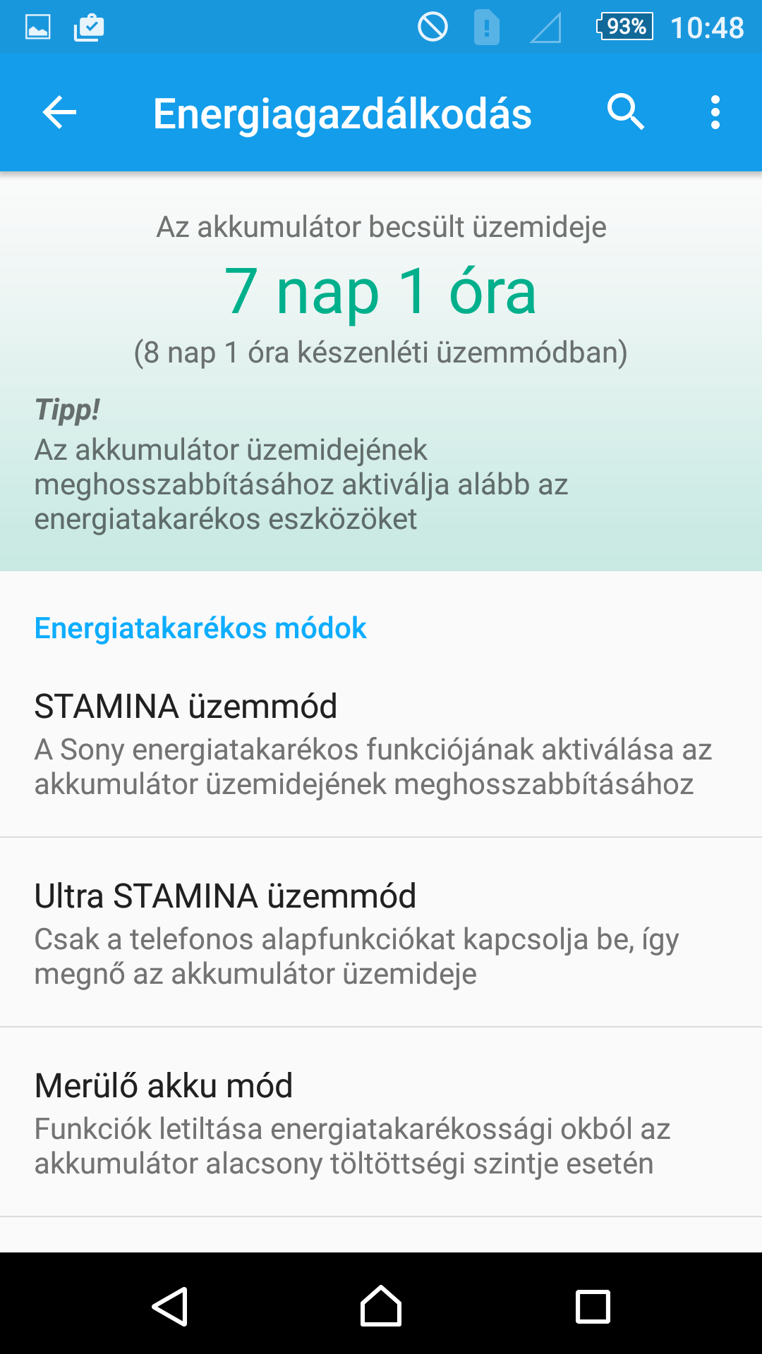 A premier során a Sony büszkén hirdette, hogy a Z5 termékcsalád tagjai töltésenként akár két napig is bírni fogják, ami már a tesztelés előtt is nehezen volt hihető, hiszen a Z3-mal összevetve az akku kapacitása csökkent (3100-ról 2900 mAh-ra), a Snapdragon 810 pedig minden csak nem energiatakarékos a 801-es lapkához képest. Ennek fényében már annak is örülhetünk, hogy az üzemidő nem csökkent. Egyébként a két nap valóban elérhető, de csak úgy, mint a korábbi Xperia modellekkel. Vagyis kíméletes használattal vagy az egyik energiatakarékos mód (Stamina) bekapcsolásával – amely ugye, rontja a használhatóságot, mivel inaktív állapotban tiltja az adatkommunikációt.