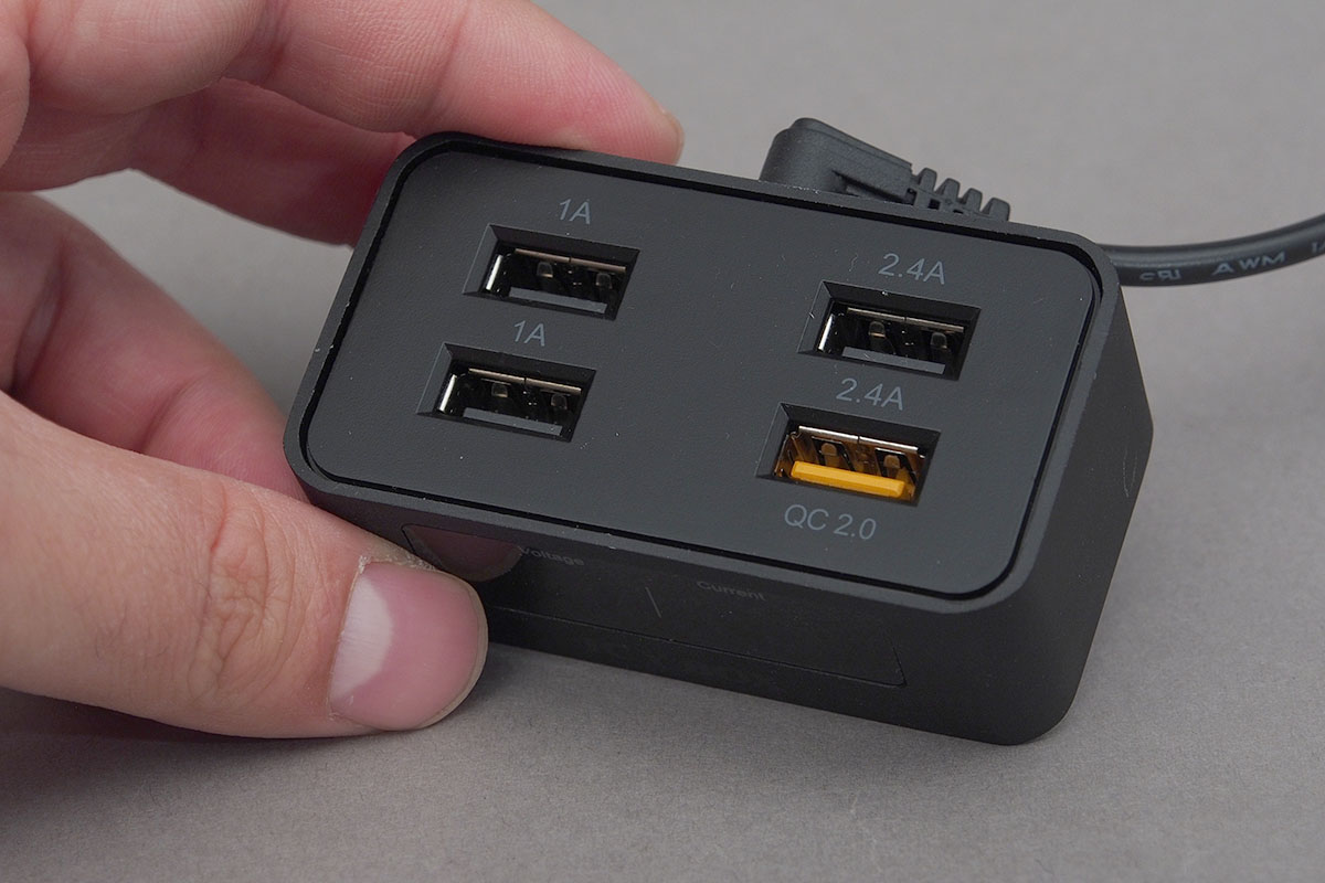 Ez az apróság egyetlen fali konnektort igényel, viszont egyszerre négy kütyü töltését is meg tudja oldani. A töltő egy apró kis dokkoló, amelyre a tápegység csatlakozóján kívül négy USB port (Type-A) és kettő kijelző került. A dokkoló kialakítása a gyártótó megszokott módon igényes, a borítás teljes egészében fémből készült. Az USB csatlakozók közül kettő legfeljebb 1 amperes, kettő pedig legfeljebb 2,4 amperes áramerősség leadásra képes, ám ennél is érdekesebb, hogy az egyik 2,4 amperes dugasz (amelyet narancssárga színnel is megjelöltek) gyorstöltő. A kütyüben lévő chipset a Qualcomm által kifejlesztett QuickCharge 2.0 szabványt ismeri, annak is az A változatát, így akár 9,7 voltos feszültséggel is tud tölteni.