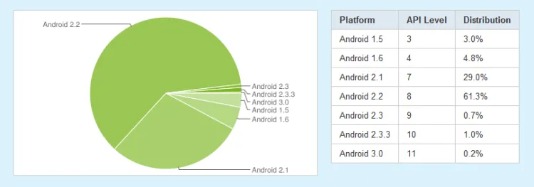 Fél év alatt közel a duplájára nőtt az Android 2.2-es verziót használó telefonok és táblagépek aránya, így jelenleg az androidos eszközök 61,3%-a használja ezt az operációs rendszert, a 2.1-és és 2.2-es verziót használók aránya együttesen pedig, első ízben, elérte a 90%-ot. Ezzel párhuzamosan természetesen jelentősen csökkent a 2.1-es, 1.6-is és 1.5-ös változatok részaránya, ezeket – sorrendben – a felhasználók 29, 4,8 illetve 3 százaléka használja már csupán.