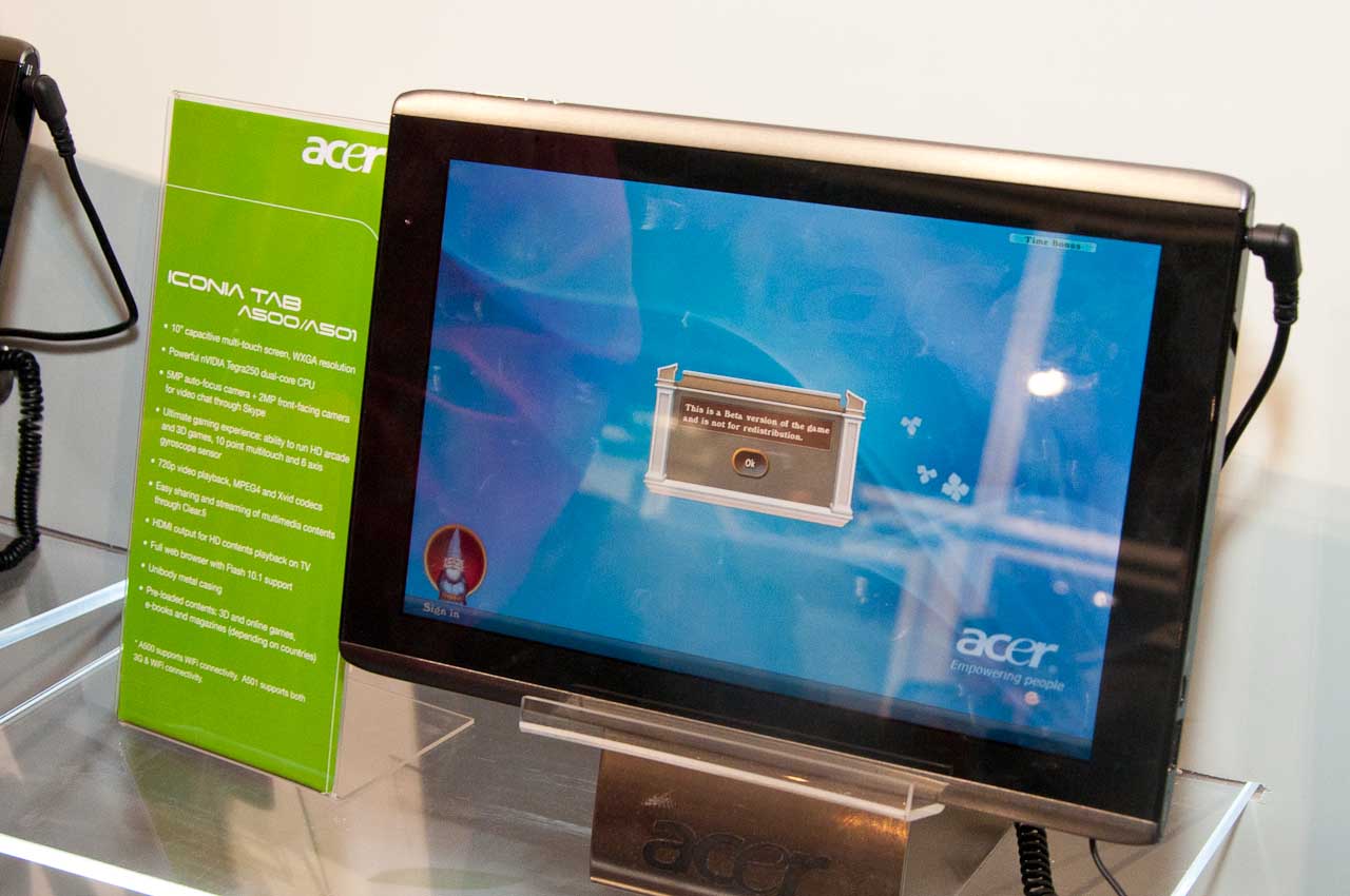 Az androidos gépek közül az A500-at és az A100-at tudtuk megnézni, de mindkettő még csak prototípusként volt kiállítva, így a használat során szerzett tapasztalatokról nem érdemes beszámolni. Maga a hardver igényes (mindkettő Tegra 2-re épül és Honeycombot fog futtatni (a nagyobbik a W500-as kijelzőjét használja, a kisebbik pedig egy 7”-os, 1024×600 pixeles változatot), az összerakásuk is jó, de a sok alumíniumnak köszönhetően elég nehezek: az A500 700, az A100 pedig 400 gramm feletti tömeggel rendelkezik.