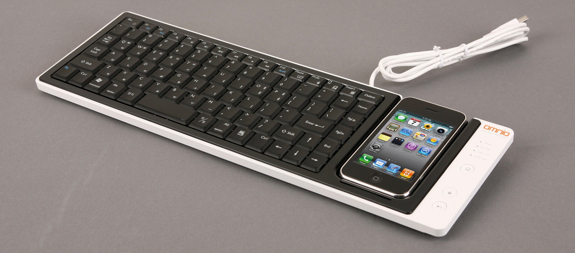 Az Omnio piacra dobta iPhone dokkolós billentyűzetét, amely Macintosh és Windows alatt egyaránt működik. A dokkoló a numerikus részleg helyére került, és természetesen az iPhone (vagy iPod touch) töltésére és az iTunesszal való szinkronizálásra is lehetőséget ad.