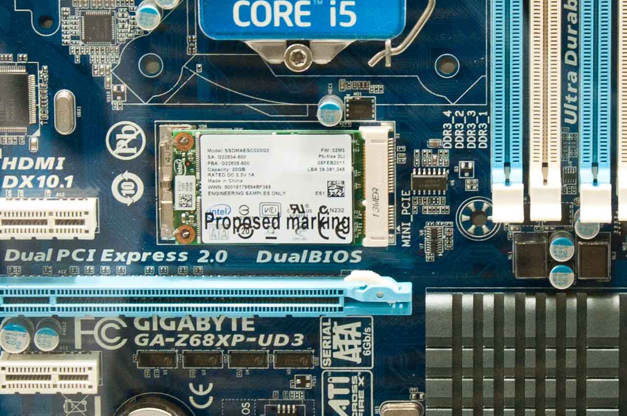 Ráadásul nem is akármilyet, az adattároló az Inteltől származik és a 311-es szériába tartozik. Az SSD mérete 20 Gbájt, ami első hallásra nem sok, de nem is azért került az alaplapra, hogy a rendszert közvetlenül erre telepítsük fel. Szerepe a cache-elés: az Intel Z68-as lapkakészletének szerves részét képező Smart Response megoldásával a gyakran használat adatok kerülnek ki az SSD-re, amivel a gép működését különösebb macera nélkül hozhatjuk fel egy SSD-t tartalmazó rendszer szintjére.