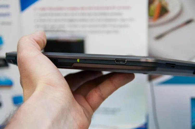 A szokásos tablet külsővel megáldott gép 10,1 colos, 1280×800 pixeles kijelzőt kapott, kávája pedig fényes fekete. A fényes előlap miatt a kép már a kiállítási csarnokban is nehezen látszott, és akkor szabadban még nem is voltunk – igaz, a rossz láthatóság nemcsak az MSI, hanem a konkurensek gépeire is igaz. A tablet külsőre majdnem késznek tűnik, mindössze egyetlen olyan lefedett nyílás volt rajta, ami egyelőre nem takart semmit. A káva a tableteknél szokásos kiegészítők (kamera elöl és hátul, fényérzékelő, érintőgombok, USB csatlakozó) mellett HDMI kimenetet is tartalmaz, illetve került rá egy optikai egér is, ami ugyan elég pici, mégis könnyű megszokni a használatát.