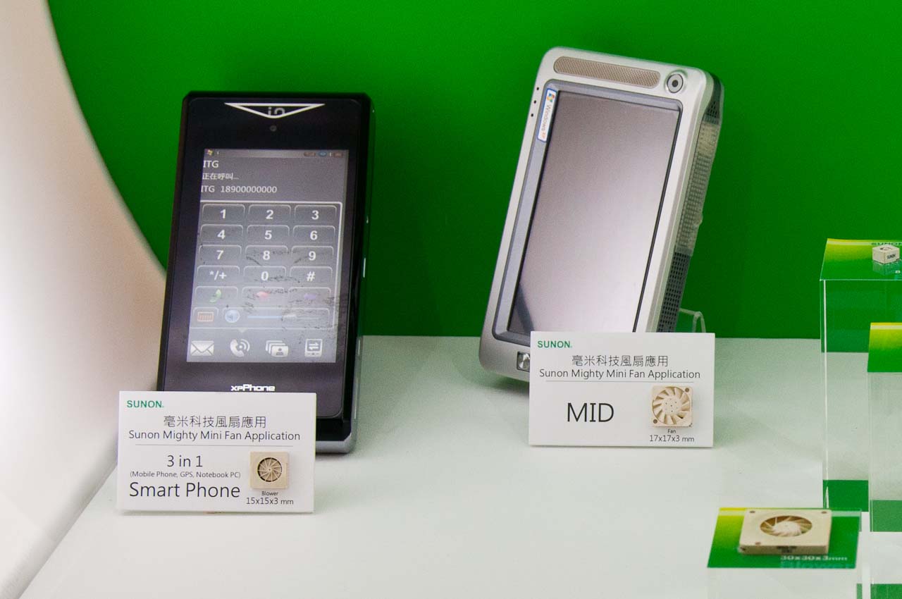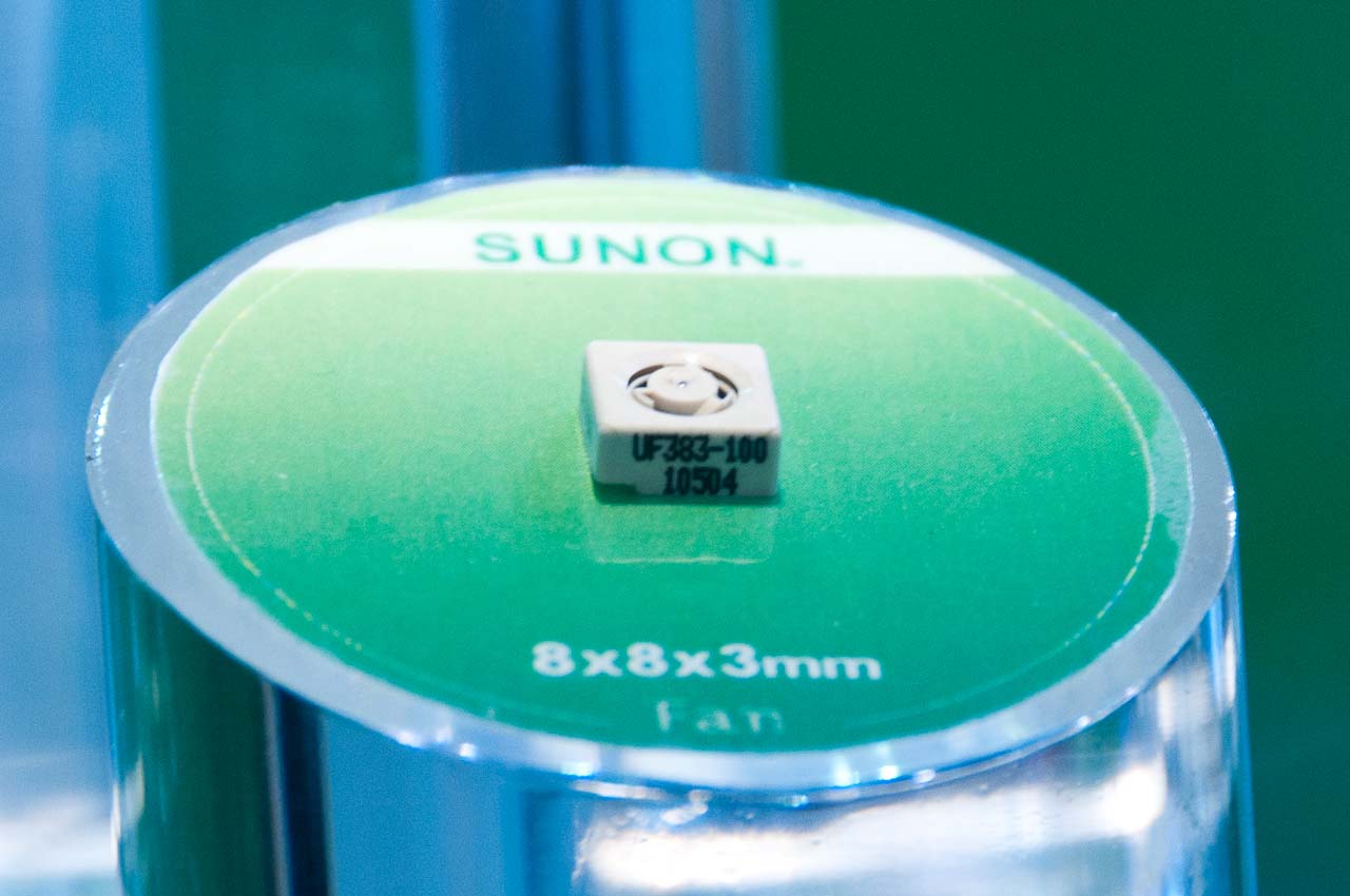 A kiállított eszközök közül az első a híres xpPhone, amelyet már több kiállításon láttunk, de felhasználó kezében még sosem találkoztunk vele, így azt sem tudjuk, hogy mekkora forgalmat generál a Sunon számára a benne használt 15×15×3 mm-es ventilátor. A kiállított modellek közül egyébként a legkisebb egy 8×8×3 mm-es példány volt, ami már nem sokkal nagyobb egy körömnél.