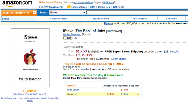 Az Apple ügyvezetője nemcsak a cégvezetéshez és a számítástechnikához ért, hanem ahhoz is, hogy ezek művelése közben igazi sztárrá váljon. Ennek köszönhető az, hogy a csak jövő márciusban megjelenő önéletrajza (iSteve: The Book of Jobs) már most három szempontból is első az Amazonnál: az Üzleti vezetők önéletrajzának listáján kívül a Technológia és a Történelem és önéletrajzok listáját is vezeti, az összes eladott könyv között pedig benne van az első 15-ben az előrendelések alapján.