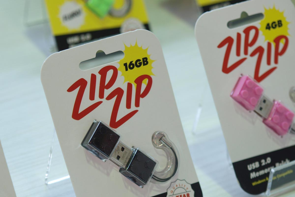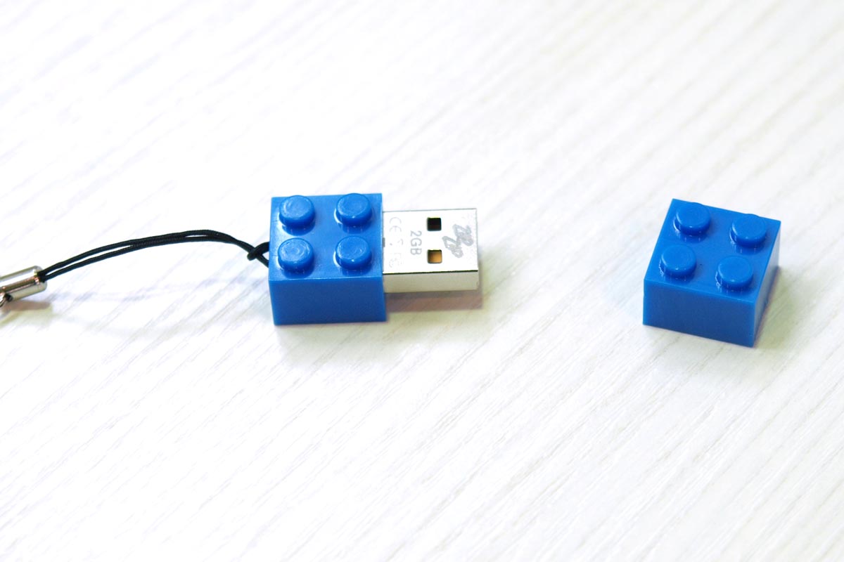 A meghökkentő alakú, méretű és tulajdonságú USB stickek közül a Zip Zip cég LEGO alakú moduljait érdemes kiemelni, amelyek kívülről éppen úgy néznek ki, mint a LEGO cég legnagyobb számban legyártott eleme, a 4×2-es normál méretű kocka. A stick valójában egy 2×2-es elem, a másik fél pedig a kupak szerepét látja el. A stick mérete 1, 2, 4, 8 és 16 Gbájt lehet, USB 2.0 kompatibilitása miatt sebessége teljesen átlagos.