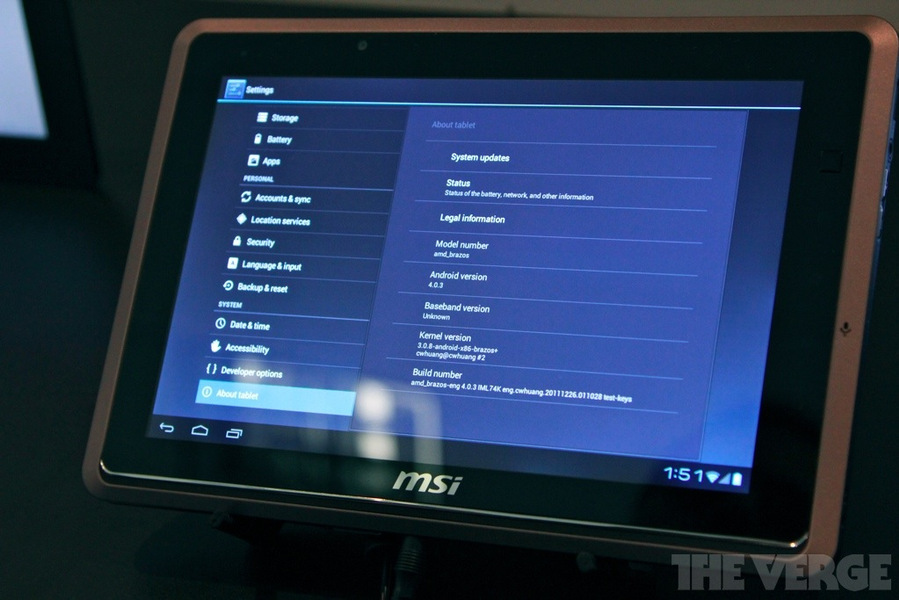 Az MSI WindPad 110W alapja egy Z01-es AMD APU, amely két 1 GHz-es processzormagot és egy Radeon HD 6250-es grafikus magot foglal magába. Az MSI demója azért is érdekes, mert, bár az Intel dolgozik a natív androidos támogatottságon, az AMD jelentősen lemaradt a tabletes és mobilos fejlesztésekben. Ennek köszönhetően bőven vannak még hibák a most demózott rendszerben is, például alkalmanként hajlamos lefagyni a rendszer. Aki esetleg már rendelkezik WindPad 110W-vel, és ki szeretné próbálni az Android 4.0-t, az már letöltheti a ROM-ot, hiszen a Google elérhetővé tette azt a fejlesztés alatt álló 4.0-s ISO-t, amelyet az AMD Brazos platformhoz készített.